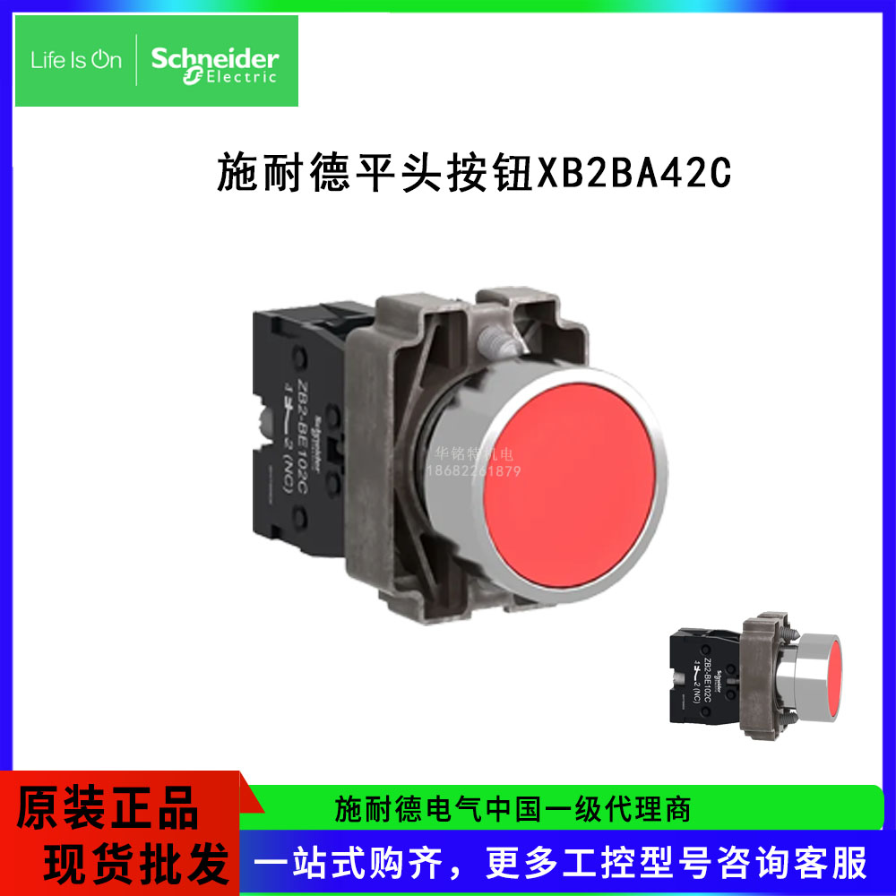 Schneider/施耐德電氣XB2B平頭按鈕XB2BA42C是一款彈簧復(fù)位,安裝直徑22mm輔助觸點1NC的紅色平頭按鈕,XB2BA42C=ZB2BZ102C+ZB2BA4C。